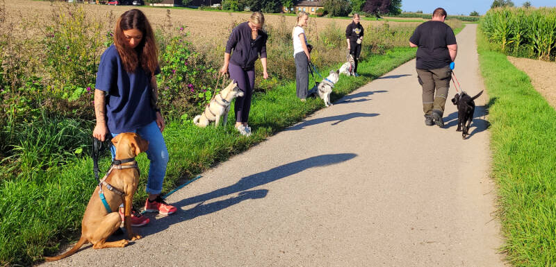 Neben dem Erlernen und Festigen der Grundkommandos, üben wir mit Euch auch außerhalb des Trainingsgeländes, wie zum Beispiel in der Stadt, auf dem Feld oder im Wald das sichere Führen Eures Hundes und stärken so die Bindung zwischen Mensch und Hund.